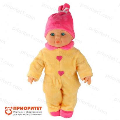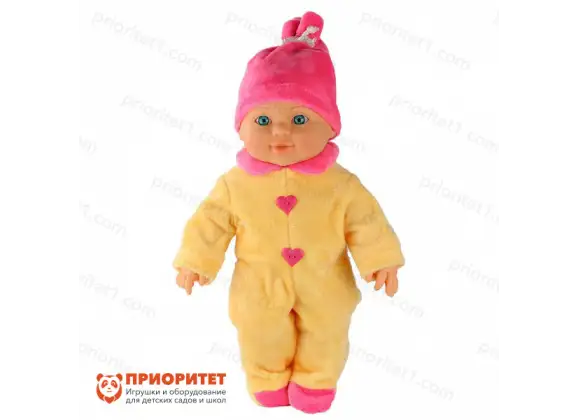 Пупс «Малышка» – это настоящая пухленькая красавица, к которой хочется подойти и обязательно потрогать, а после и вовсе взять на руки. Она станет непревзойденной фавориткой среди прочих игрушек ребенка. Наряд куклы состоит из комбинезона с длинным рукавом в светлых тонах с пуговками сердечками и яркой шапочки.