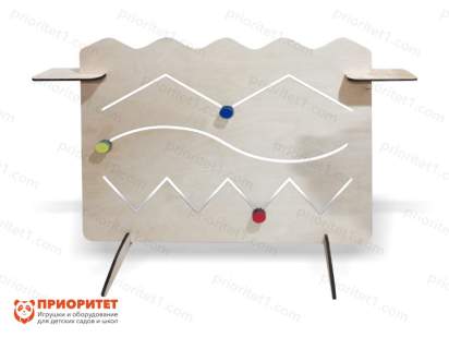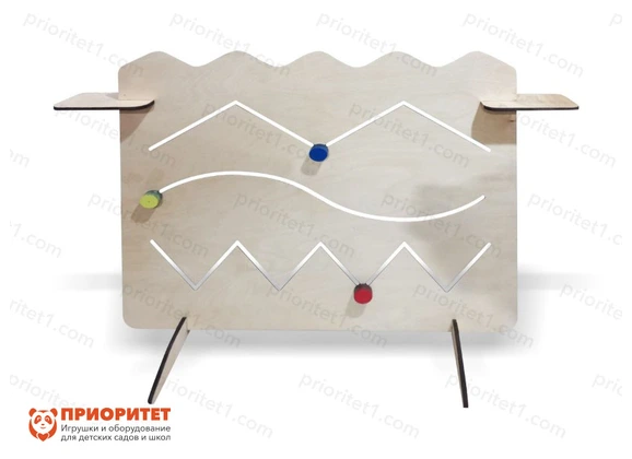 - Панель выполнена из гладкой фанеры, сверху покрыта лаком, чтобы избежать появления заусениц. Чтобы дополнительно обезопасить малышей, углы были скруглены, а конструкция поставлена на широкие опоры.