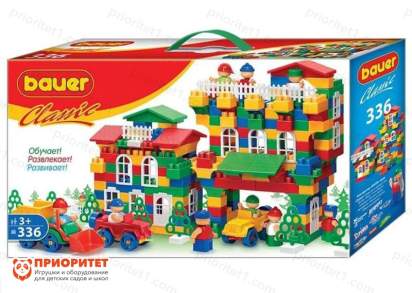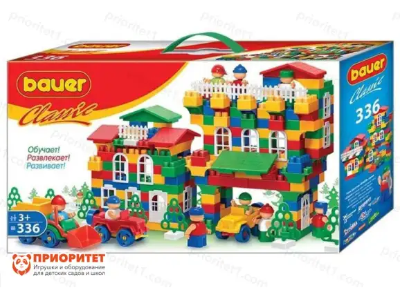 Конструктор Bauer (336 деталей) — современное воплощение легендарного блочного конструктора для детей от 3 лет. Набор включает разноцветные кубики, фигурки человечков, инструменты и элементы для создания техники и городского пейзажа: сборные машинки, заборы, деревья, окна, двери и крыши.