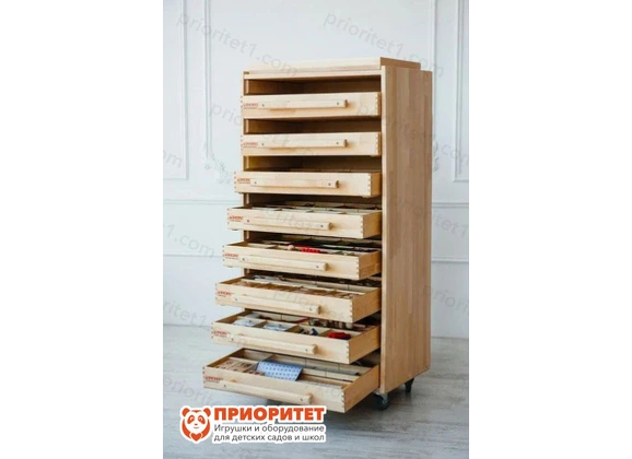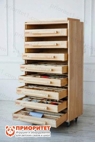 - Детали целиком сделаны из натурального дерева: не имеют острых углов, тщательно отшлифованы от заусениц и покрыты лаком. Часть деталей оставлена в естественном окрасе, другая – покрашена безопасной водной краской. Каждая деталь имеет собственное место в модуле. Модули расположены в стеллаже на колесах, который удобно перевозить.