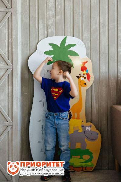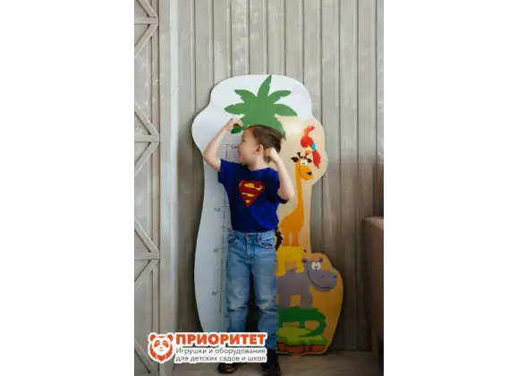 Дизайн ростомера, выполненный в африканском стиле, привлекает внимание детей и подходит для любого интерьера. Его можно установить и в детской комнате дома, и в группе дошкольного учреждения. Жираф, бегемот, попугай, лев и крокодил, изображенные на ростомере, как и большинство малышей, желают узнать свой рост. Благодаря конструкции с разметками удобно наблюдать изменения в росте ребенка.