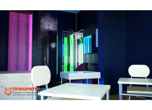 - Сенсорный уголок моно с большой пузырьковой колонной (диаметр 18 см., высота 2 м.). Мягкая тумба, настенные безопасные зеркала в скругленном профиле из анодированного алюминия.