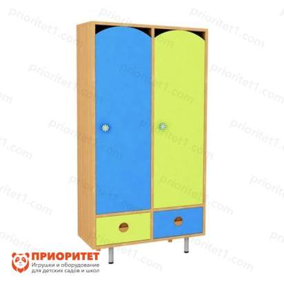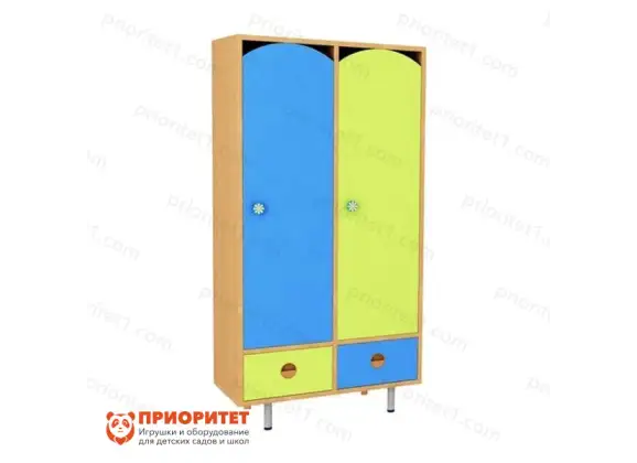 Шкаф окрашен в безопасные, насыщенные цвета. Он стоит благодаря тонким, но прочным ножкам. Конструкция шкафа разработана и собрана таким образом, чтобы он не мог под тяжестью веса одежды перевернуться или упасть вперёд. Это помогает избежать многих травм и несчастных случаев. Дверцы шкафа окрашены в разные цвета для того, чтобы дети могли запоминать их и пользоваться всё время. У шкафа есть дверцы и выдвижные ящики, в них можно хранить все вещи, которыми ребёнок пользуется в детском саду.