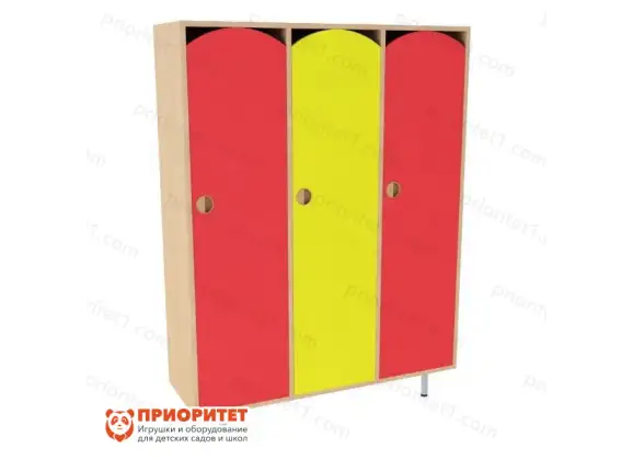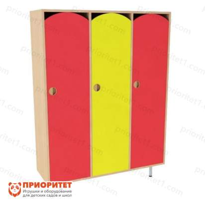 Модель имеет окраску и три двери. В отличие от других моделей эта заметно краше и практичнее. Она полностью покрыта защитным слоем, во избежание получения травм и появления царапин на поверхности. Углы шкафа сглажены, так что малыш не поранится, если случайно заденет край стенки шкафа. В трёх секциях можно поместить верхнюю одежду, головной убор и обувь. Ребёнок научится пользоваться предметом и сможет делать это каждый день. Со временем малыш беспрепятственно будет открывать дверцу, и доставать необходимые предметы.
