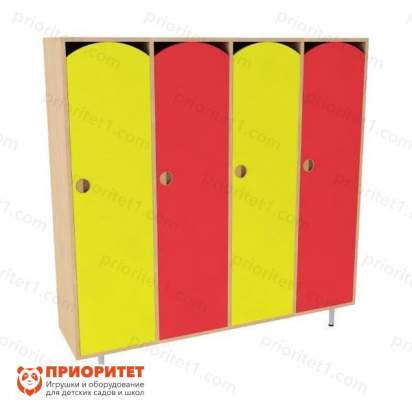 Шкафчик рассчитан для хранения вещей. Четыре секции — это удобное решение для больших раздевалок. Мебель можно расставлять по стенке или иначе, если это соответствует нормам. Функциональный шкафчик выполнен из прочного материала. ЛДСП не деформируется, отличается высоким сроком эксплуатации. Небольшой вес конструкции поваляет легко перемещать мебель.