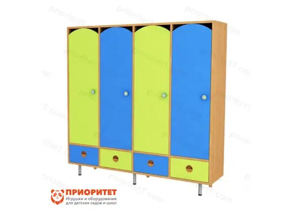 Шкаф предназначен для хранения одежды и обуви. Четыре секции распределяться между четырьмя детьми при помощи жеребьёвки или считалочки. Это должен решать педагог, потому что так можно избежать несправедливых решений. Каждая дверь шкафа окрашена в отличный от других цвет. Как правило, они чередуются для создания гармонии или привыкания глаза к поочередной окраске предмета. Тонкие ножки предмета на самом деле обладают устойчивостью и не позволят шкафу упасть.