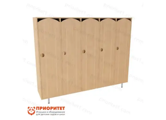Модель одноярусная, состоит из пяти секций. Функциональные размеры соответствуют ростовой категории детей дошкольного возраста. Малыши могут самостоятельно открывать дверцу и складывать одежду, не становясь на подставку и не прибегая к посторонней помощи.