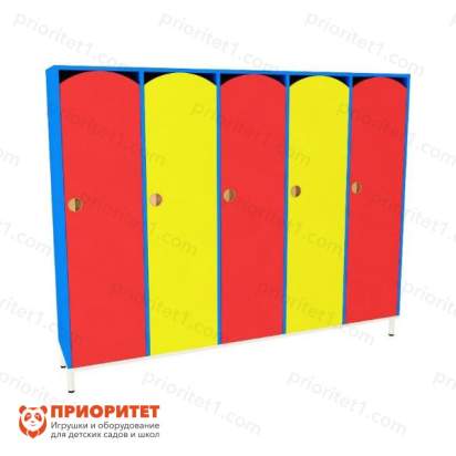 Модель предназначена для раздевалок детских садов и центров. Подойдет даже для небольшого помещения. Шкаф разделен на пять секций, каждой может пользоваться один ребенок. Располагается вдоль стены, имеет ножки. Дверцы одинаковые, монотонно-окрашенные. Чтобы ребенок запомнил свой шкафчик, его можно обозначить изображением любимого животного, сказочного героя или номером.