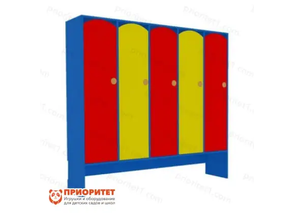 Шкаф для раздевалки состоит из 5 секций. Каждая секция имеет свою дверцу. Конструкция шкафа предусматривает нишу для скамейки. Корпус и фасады окрашены в разные цвета.