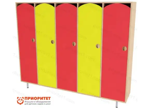 Шкаф предназначен для хранения вещей ребенка размещается в раздевалке или прихожей детского садика. Конструкция простая, прямоугольной формы, устанавливается на ножки. Рационально расположить несколько 5-ти секционных шкафчиков в ряд у стены. Каждый ребенок получит отдельный шкафчик и свободное пространство для переодевания и общения.