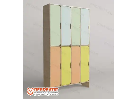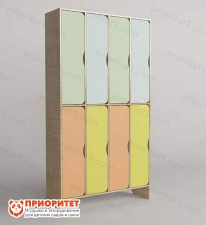 Удобный шкаф для детских вещей состоит из 8 шкафчиков. Благодаря второму ярусу шкафчики расположены в 2 ряда: 4 сверху и 4 снизу. Такая конструкция экономит место и может быть использования для помещений небольшой площади.