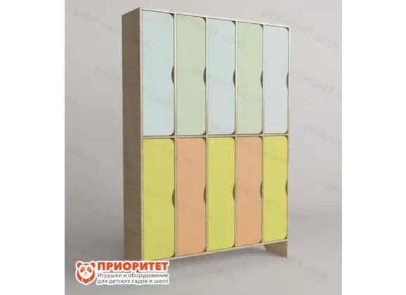 Вместительный шкаф для одежды состоит из двух ярусов. В каждом ряду расположено по 5 отдельных секций с собственной дверцей. Шкаф рассчитан на 10 человек.