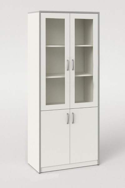 - Раздельные зоны хранения: верхние 3 полки закрыты стеклянными дверцами — удобно видеть содержимое; нижние 2 полки закрыты распашными дверями для аккуратного хранения.