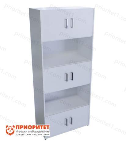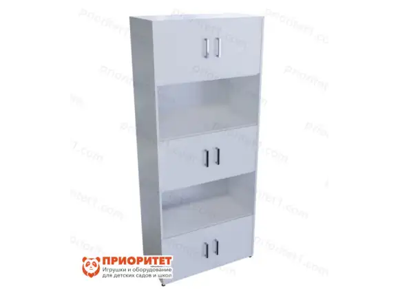 Шкаф состоит из пяти полок. Три из них открытые, а две закрыты глухими дверцами. На открытых полках можно расположить демонстрационный материал, наглядные пособия и хранить предметы, которые постоянно используются в процессе обучения.А в закрытые отделения сложить учебную литературу, тетрадки или запасы канцтоваров.