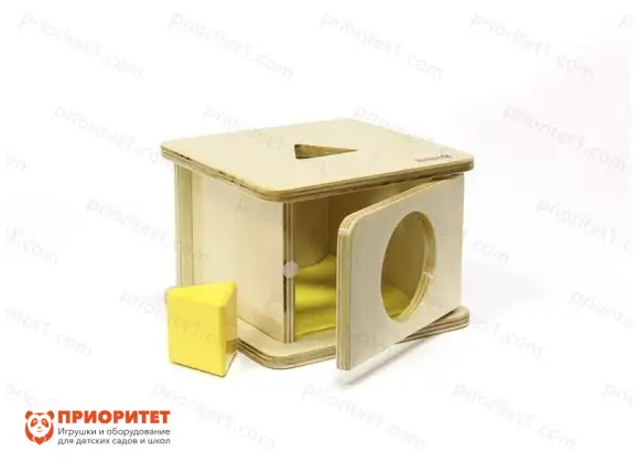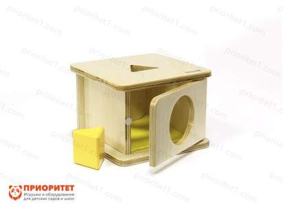 - Представляет собой тренажер в виде коробки: сверху имеет треугольную прорезь, чтобы просовывать геометрическую фигурку, а спереди – открывающуюся дверку. Цель ребенка – научиться класть и забирать предмет из коробки, при этом можно использовать как дверку, так и дыру в ней.