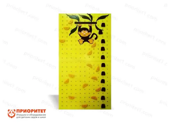 Модель скалодрома состоит из двух фанерных панелей желтого цвета, с отверстиями для зацепов. Зацепы выполнены из натурального прочного дерева, окрашены. Наверху изображена милая мартышка, качающаяся на лианах. Зацепы равномерно крепятся на панелях, так чтобы ребенок мог за них цепляться руками и опираться ногами.