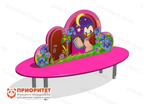 Сидение и спинка выполнены из влагостойкой прочной фанеры, толщиной 18 мм. Фанера обработана грунтовкой с водоотталкивающим эффектом. На поверхности нанесен тематический рисунок с изображением птички на фоне ночного пейзажа. Скамейка имеет фигурную яркую спинку и овальное сидение, расположенное вокруг спинки. Установлена скамейка на металлических ножках, сделанных из стального профиля. В сечении ножки квадратные, с гранью 25 мм.