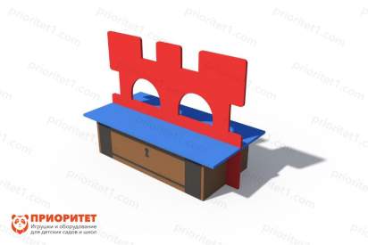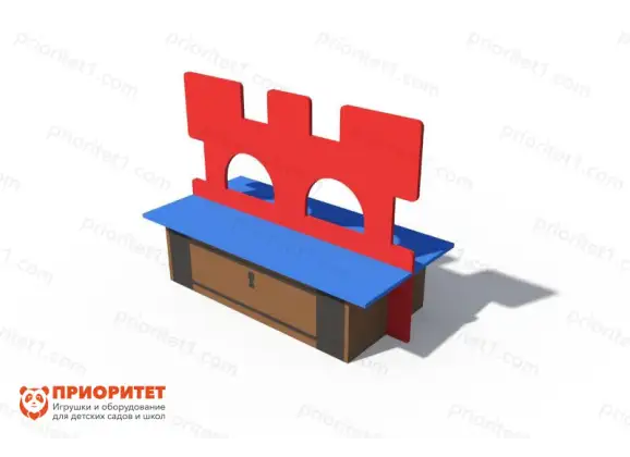 Скамейка в виде сундука с сокровищами станет достойным украшением любой детской площадки. Конструкция окрашена в приятые цветовые оттенки. Интересная форма быстро привлечет внимание ребят и станет их любимым местом. Для удобства и в целях расширения посадочных мест сиденья расположены по обеим сторонам. Дети могут представлять себя пиратами, путешествовать с друзьями по морям и островам.