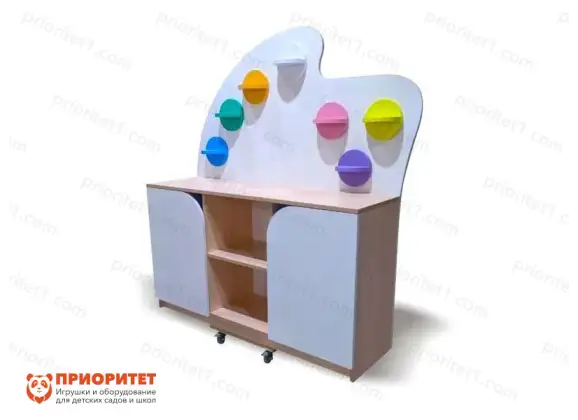Стеллаж «Акварелька» – это мебель, предназначенная для хранения художественных принадлежностей и рисунков детей. Представляет собой дизайнерский шкаф в виде палитры. Имеет открытые и закрытые полки, на которых можно раскладывать раскраски, фломастеры и карандаши.