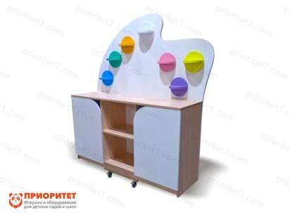 - Стеллаж предназначен для детских учреждений. Вмещает полный набор художественных принадлежностей для маленькой группы детей.