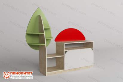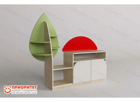 - Стеллаж сделан в уникальном стиле с природным ландшафтом: на заднем корпусе есть полки в виде ветвей дерева. Малыши могут расставлять предметы и знакомиться с природой.