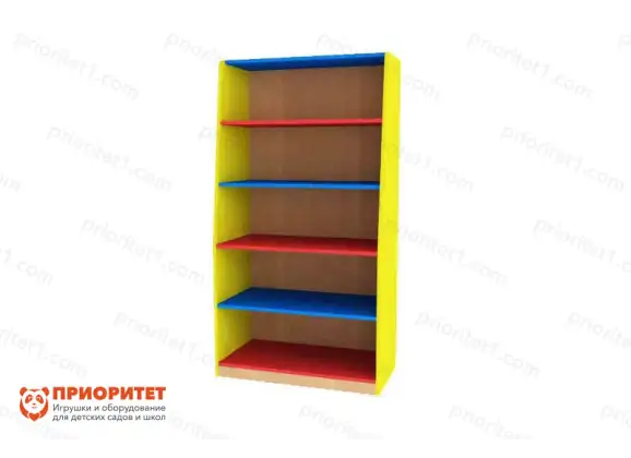 - Стеллаж сделан в простом стиле с округлыми формами. Выкрашен в сочные цвета, которые помогут детям быстро выучить основные цвета.