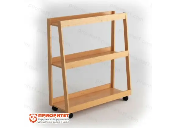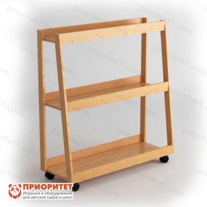 - Стеллаж изготовлен из натурального дерева: материал был обработан до идеально ровной поверхности и покрыт защитным лаком, чтобы предотвратить появление опасных заусениц, а также сохранить конструкцию от быстрого износа. Имеет колесики для удобного перемещения по комнате.