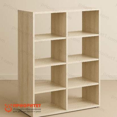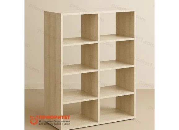 Размер стеллажа: 100х50х130 см. В конструкции предусмотрено 8 равных ячеек, что позволяет использовать его для книг, папок, контейнеров или предметов декора. Отсутствие задней стенки делает стеллаж лёгким и визуально открытым.