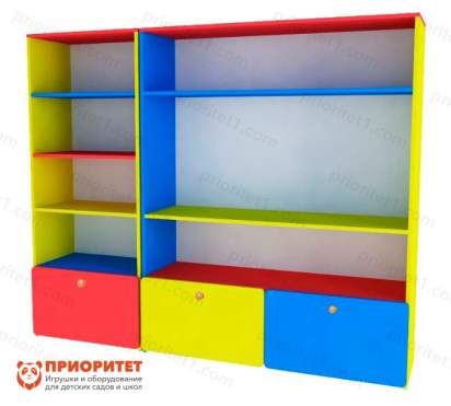 Разработанный специально для оформления интерьеров детских садов стеллаж «Незнайка» отличается легкими элементами дизайна и красочной, позитивной расцветкой. В открытых секциях двух размерах и трех скрытых за дверцами нижних отделениях можно удобно разместить все, что только может понадобиться детям — от игрушек до обучающих материалов. Стеллаж изготовлен из ЛДСП 16 мм — прочного, надежного и безвредного современного материала, а его кромки — покрыты 2 мм ПВХ.