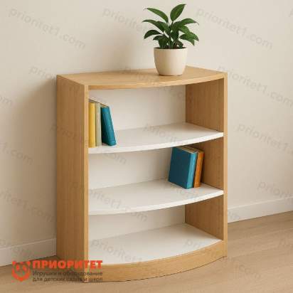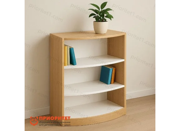 Высота 106 см. делает полки доступными для детей и взрослых, а изогнутая лицевая линия обеспечивает безопасность и удобство при работе с материалами. На полках можно разместить книги, методические пособия, настольные игры, сувениры или выставочные материалы.