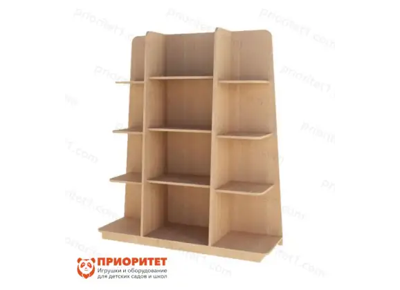 Стеллаж «Пирамида» может стать главным элементом в интерьере детского зала. В его дизайне нет ничего броского, он классический даже в цвете под натуральную древесину тона «капучино», но при этом — оригинальный за счет того, что все полочки стеллажа немного различаются между собой по высоте. Благодаря этому, размещенные на нем вещи смотрятся необычно, ни одна из них не теряется визуально. Стеллаж изготовлен из 16 мм ЛДСП, включая заднюю стенку, а его конструкция усилена пластиковой 4 мм опорой.