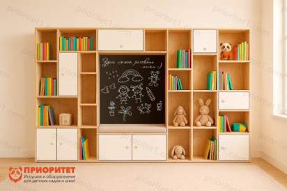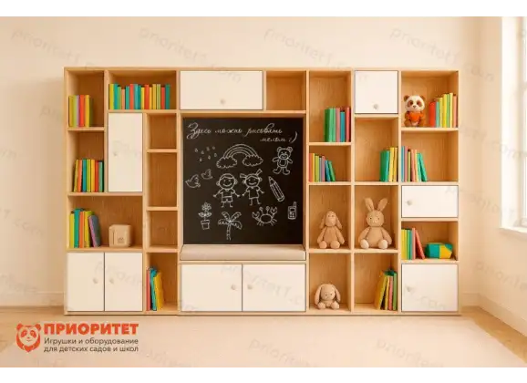 Детский стеллаж с меловой доской — современный комплект мебели для хранения, игр и творчества в ДОУ и развивающих центрах.