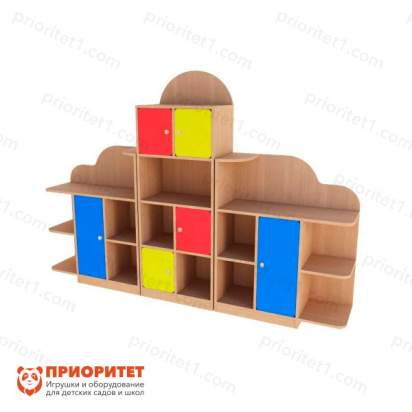 Стеллаж-стенка «Антошка» (цветной фасад) – это крупный комплекс, предназначенный для расстановки и хранения детских игрушек. Представляет собой шкаф из открытых и закрытых полок, на которые раскладывают учебные принадлежности, игрушки или самодельные работы детей.