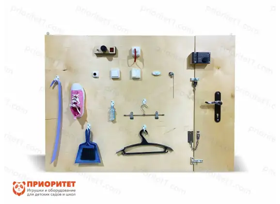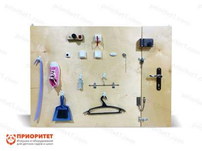 В игровой форме дети познакомятся с выключателями, защелками, дверными ручками, розетками, крючками и вешалками. Этот развивающий стенд посвящен теме «Прихожая комната». Ежедневно малыш видит эти элементы у себя дома, в гостях. Такой стенд позволяет ребенку научиться пользоваться каждым приспособлением, без которых сложно представить быт современного человека. Все элементы надежно прикреплены к доске. Стенд имеет гладкую отшлифованную поверхность. Поэтому игры будут абсолютно безопасными для дошкольников любого возраста.