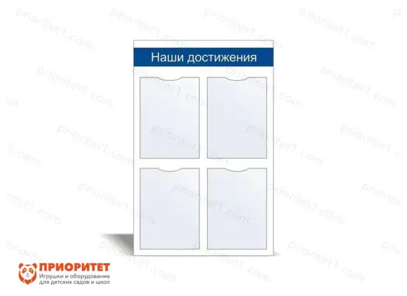 Стенд информационный «Наши достижения» №1 имеет соответствующую сертификацию по всем требованиям ФГОС. Он имеет 4 плоских кармана размера А4. Основа стенда выполнена из гипоаллергенного белого пластика ПВХ, а прозрачные карманы сделаны из ПЭТ. Все материалы безопасны для здоровья детей. Чтобы детям было еще интереснее узнавать о собственных достижениях и о достижениях своих друзей, стенд можно украсить.