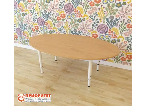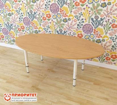 Универсальная мебель для обустройства группы в детском саду имеет овальную форму и располагается на устойчивых телескопических ножках. Стол изготовлен по ГОСТу и не несет вреда здоровью малышей. Стол подходит для ясельных и младших групп в детском саду, а также его можно использовать в домашних условиях для дополнения обстановки в комнате ребенка.