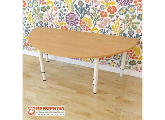 - Полукруглый стол обладает габаритами 1120мм в длину и 560мм в ширину. Пространства на поверхности достаточно, чтобы разложить все необходимые игрушки и без труда находить их;