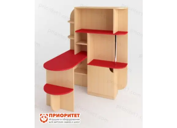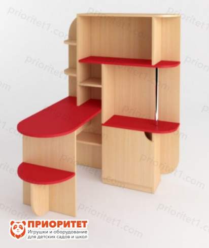 Практичный стол-стеллаж поможет решить проблему в организации рабочего пространства. За счет большого количества вместительных полок он позволяет хранить множество различных вещей – от книг до игрушек. Большая столешница удобна для проведения с малышами творческой работы, а все необходимые материалы и инструменты можно удобно расположить в досягаемом пространстве. Мебель отлично подойдет для детского сада, так как имеет яркие цвета, которые зададут позитивный настрой любому помещению. Все углы и края имеют скругления, а элементы фурнитуры утоплены в корпус, что делает мебель полностью безопасной для малыша.