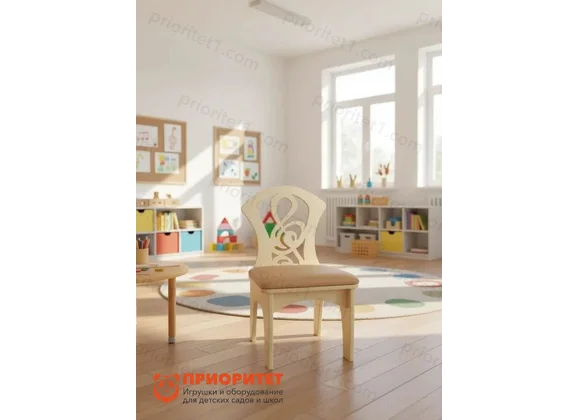 - Детский стул из натурального дерева отличается изысканным дизайном и комфортным сиденьем. Спинка стула представляет собой скрипичный ключ. Ажурный узор создает праздничную атмосферу.