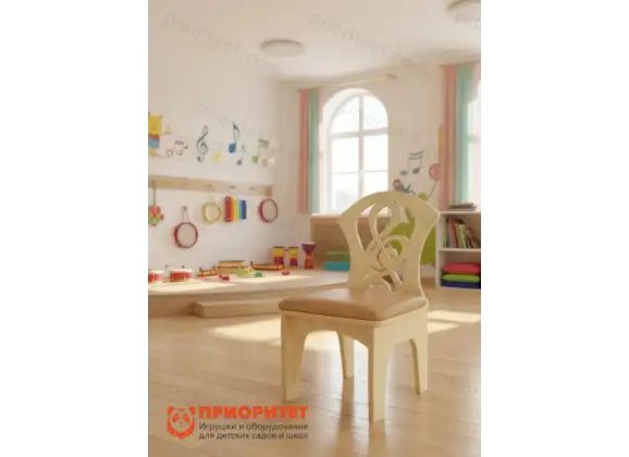 - Изящный детский стул со спинкой в виде скрипичного ключа изготовлен из натурального дерева. Он станет интересным акцентом в обстановке актового зала и создаст творческую атмосферу в комнате для занятий музыкой. Стул дополнен с мягким сиденьем.