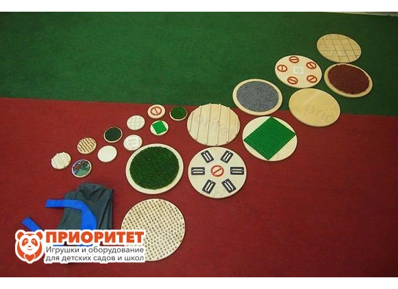 Тактильная дорожка «Тактильные диски» - это развивающая цепочка из круглых элементов, которые отличаются по текстуре и материалу. Ходить по такой дорожке следует чистыми босыми ногами, так как идет активное воздействие именно на стопу. В процессе занятий происходит: развитие координации в пространстве, профилактика плоскостопия, тренируется внимательность и сенсорный опыт малышей. Рецепторы стопы ощущают на себе различные виды материалов, что положительно сказывается на самочувствии малышей.