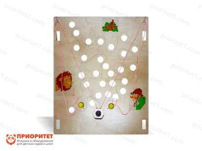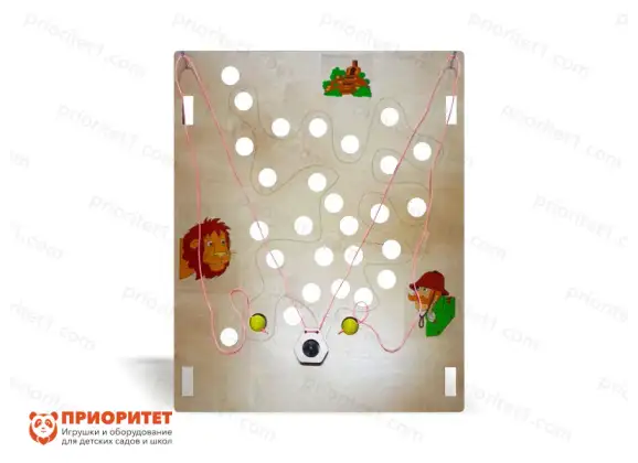 Интересный дизайн панели и нарисованные персонажи привлекают внимание детей и вызывают их интерес к игре. На панели имеются крупные дырочки, расположенные в хаотичном порядке, шарик в корзинке, подвешенной на веревочки, и рисунки, изображающие охотника, льва и замок. Между дырочками проведена дорожка, по которой можно водить пальчиком для стимуляции тактильных рецепторов. Оборудование рекомендуется использовать в дошкольных организациях, центрах развития и реабилитации детей, домашних условиях.