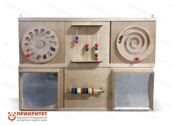 - Четвертая панель квадратной формы содержит выпуклое зеркало, также закрытое прозрачным пластиком. Пластиковая поверхность не влияет на зеркальное отображение предметов и лиц малышей. Искривленное отражение помогает укрепить пространственное мышление и освоить базовый анализ. Ребенок, смотря в зеркальную поверхность, находит знакомые предметы, которые его окружают, и ассоциирует изображение с помещением, в котором находится.