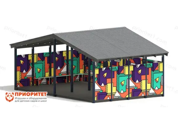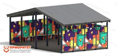 Навес имеет ярко окрашенные стенки с рисунками геометрических фигур. Внутри по периметру расположены скамейки, на которых дети могут присесть, положить вещи. Крыша треугольная, установлена на 16 металлических опорах. Форма крыши сконструирована таким образом, чтобы вода стекала по бокам навеса небольшими струйками.