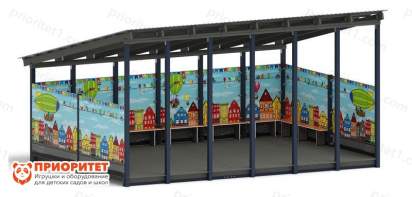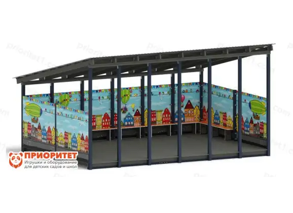 Конструкция оснащена скамейками, на которых можно уложить игрушки, вещи или посидеть. Навес имеет три стены, панели которых разрисованы видами сказочного города: