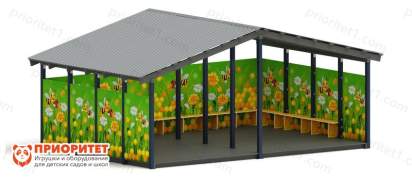 Яркий теневой навес является отличным решением для оборудования детской площадки в дошкольном учреждении. Во время непогоды или яркого солнца малыши смогут комфортно разместиться внутри. Можно отдохнуть на уютных скамейках или провести ряд активных игр – широкое пространство позволяет не ограничиваться в движении. Стенки и двускатная крыша не позволят ветру, дождю или жаркому солнцу помешать игре малышей, а яркий дизайн привнесет в нее позитивную атмосферу.