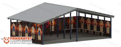 Теневой навес в принтом средневекового замка гармонично дополнит любую детскую площадку. Он рекомендован для оборудования дошкольных учреждений, так как создает оптимальные условия для прогулки детей даже во время непогоды. Прочные стены и двускатная крыша защитят малышей от палящего солнца, дождя и сильного ветра, не позволив погодным капризам прервать игру. Внутри навеса малыши могут свободно проводить активные игры или отдыхать на скамейках, так как он имеет расширенное пространство.