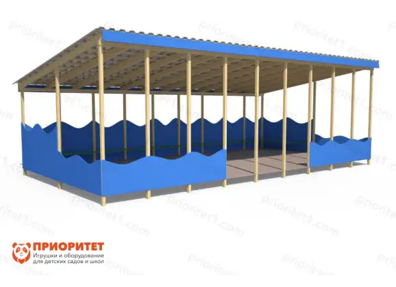 Теневой навес «Волна» выполнен в нейтральном дизайне, который подойдет для любого детского заведения и учреждения. Также может быть расположен на берегу водоемов, на территории детского лагеря и т.д. Навес можно переоборудовать под собственные нужды и дополнить его различным оборудованием. Стены конструкции защищены не полностью, благодаря чему осуществляется постоянная циркуляция воздуха.