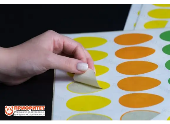 Комплект состоит из 10 листов с наклейками в форме овала, размерами близкими к куриному яйцу. На каждом листе 18 фигур, по 6 фигур желтого, оранжевого и зеленого цвета. Наклейки легко отделяются от основы и приклеиваются к бумаге. Комплект предназначен для прохождения субтеста № 2 с овалами по методу Торренса.