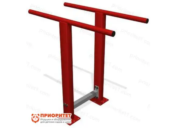 Брусья представляют собой две вертикальные опоры, расположенные параллельно друг к другу. Сверху закреплены жерди для отжиманий, позволяющие выполнять упражнения, направленные на развитие разных групп мышц. Внизу опоры соединены металлической перемычкой, не позволяющей конструкции изменить свою целостность в результате значительных нагрузок или интенсивного использования. Оборудование предназначено для оснащения спортивных площадок со специальным противоскользящим покрытием и жестким фундаментом.